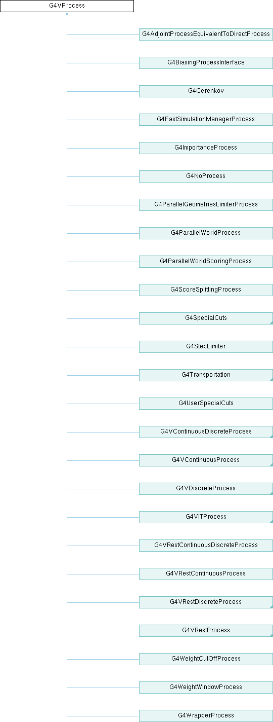 Implemented in G4AdjointProcessEquivalentToDirectProcess, G4BiasingProcessInterface, G4Cerenkov, G4CoupledTransportation, G4DNABrownianTransportation, G4DNAScavengerProcess, G4DNASecondOrderReaction, G4DynamicParticleIonisation, G4DynamicParticleMSC, G4FastSimulationManagerProcess, G4ImportanceProcess, G4ITTransportation, G4NoProcess, G4NuclearStopping, G4ParallelGeometriesLimiterProcess, G4ParallelWorldProcess, G4ParallelWorldScoringProcess, G4ScoreSplittingProcess, G4SpecialCuts, G4StepLimiter, G4Transportation, G4TransportationWithMsc, G4UserSpecialCuts, G4VContinuousDiscreteProcess, G4VContinuousProcess, G4VDiscreteProcess, G4VEnergyLossProcess, G4VITDiscreteProcess, G4VITRestDiscreteProcess, G4VITRestProcess, G4VMultipleScattering, G4VRestContinuousDiscreteProcess, G4VRestContinuousProcess, G4VRestDiscreteProcess, G4VRestProcess, G4WeightCutOffProcess, G4WeightWindowProcess, and G4WrapperProcess.