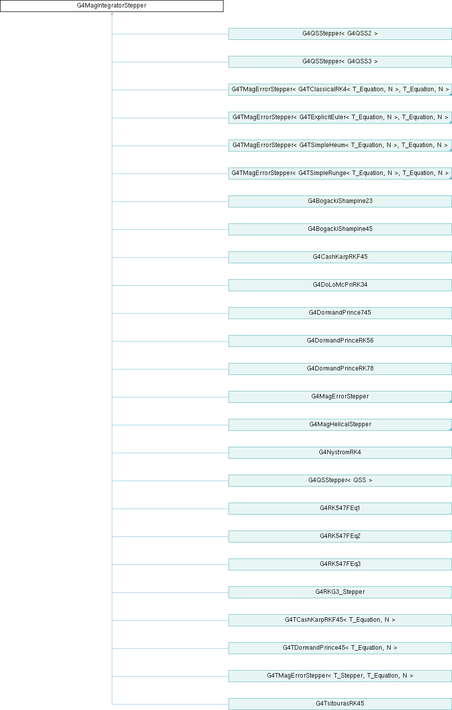 Implemented in G4BogackiShampine23, G4BogackiShampine45, G4CashKarpRKF45, G4ConstRK4, G4DoLoMcPriRK34, G4DormandPrince745, G4DormandPrinceRK56, G4DormandPrinceRK78, G4ExactHelixStepper, G4HelixMixedStepper, G4MagErrorStepper, G4MagHelicalStepper, G4NystromRK4, G4QSStepper< QSS >, G4QSStepper< G4QSS2 >, G4QSStepper< G4QSS2 >, G4QSStepper< G4QSS3 >, G4QSStepper< G4QSS3 >, G4RK547FEq1, G4RK547FEq2, G4RK547FEq3, G4RKG3_Stepper, G4TCashKarpRKF45< T_Equation, N >, G4TDormandPrince45< T_Equation, N >, G4TMagErrorStepper< T_Stepper, T_Equation, N >, G4TMagErrorStepper< G4TClassicalRK4< T_Equation, N >, T_Equation, N >, G4TMagErrorStepper< G4TExplicitEuler< T_Equation, N >, T_Equation, N >, G4TMagErrorStepper< G4TSimpleHeum< T_Equation, N >, T_Equation, N >, G4TMagErrorStepper< G4TSimpleRunge< T_Equation, N >, T_Equation, N >, and G4TsitourasRK45.