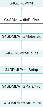 Inheritance diagram for G4GDMLWriteDefine:Public Member Functions | |