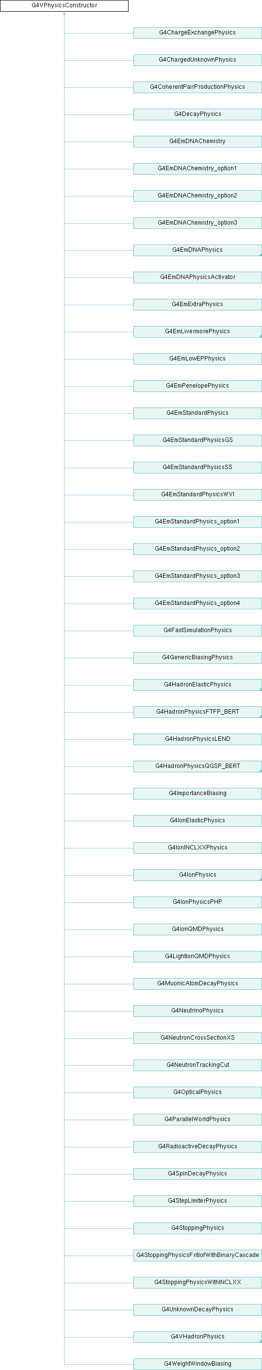 Implemented in G4ChargedUnknownPhysics, G4ChargeExchangePhysics, G4CoherentPairProductionPhysics, G4DecayPhysics, G4EmDNAChemistry, G4EmDNAChemistry_option1, G4EmDNAChemistry_option2, G4EmDNAChemistry_option3, G4EmDNAPhysics, G4EmDNAPhysicsActivator, G4EmExtraPhysics, G4EmLivermorePhysics, G4EmLowEPPhysics, G4EmPenelopePhysics, G4EmStandardPhysics, G4EmStandardPhysics_option1, G4EmStandardPhysics_option2, G4EmStandardPhysics_option3, G4EmStandardPhysics_option4, G4EmStandardPhysicsGS, G4EmStandardPhysicsSS, G4EmStandardPhysicsWVI, G4FastSimulationPhysics, G4GenericBiasingPhysics, G4HadronElasticPhysics, G4HadronPhysicsFTFP_BERT, G4HadronPhysicsLEND, G4HadronPhysicsQGSP_BERT, G4ImportanceBiasing, G4IonElasticPhysics, G4IonINCLXXPhysics, G4IonPhysics, G4IonPhysicsPHP, G4IonQMDPhysics, G4LightIonQMDPhysics, G4MuonicAtomDecayPhysics, G4NeutrinoPhysics, G4NeutronCrossSectionXS, G4NeutronTrackingCut, G4OpticalPhysics, G4ParallelWorldPhysics, G4RadioactiveDecayPhysics, G4SpinDecayPhysics, G4StepLimiterPhysics, G4StoppingPhysics, G4StoppingPhysicsFritiofWithBinaryCascade, G4StoppingPhysicsWithINCLXX, G4UnknownDecayPhysics, G4VHadronPhysics, and G4WeightWindowBiasing.