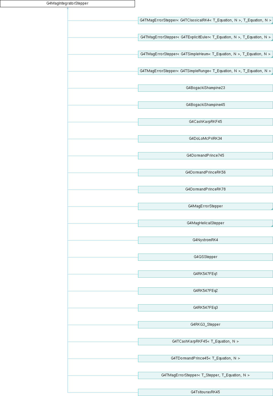 Implemented in G4BogackiShampine23, G4BogackiShampine45, G4CashKarpRKF45, G4ConstRK4, G4DoLoMcPriRK34, G4DormandPrince745, G4DormandPrinceRK56, G4DormandPrinceRK78, G4ExactHelixStepper, G4HelixMixedStepper, G4MagErrorStepper, G4MagHelicalStepper, G4NystromRK4, G4QSStepper, G4RK547FEq1, G4RK547FEq2, G4RK547FEq3, G4RKG3_Stepper, G4TCashKarpRKF45< T_Equation, N >, G4TDormandPrince45< T_Equation, N >, G4TMagErrorStepper< T_Stepper, T_Equation, N >, G4TMagErrorStepper< G4TClassicalRK4< T_Equation, N >, T_Equation, N >, G4TMagErrorStepper< G4TExplicitEuler< T_Equation, N >, T_Equation, N >, G4TMagErrorStepper< G4TSimpleHeum< T_Equation, N >, T_Equation, N >, G4TMagErrorStepper< G4TSimpleRunge< T_Equation, N >, T_Equation, N >, and G4TsitourasRK45.