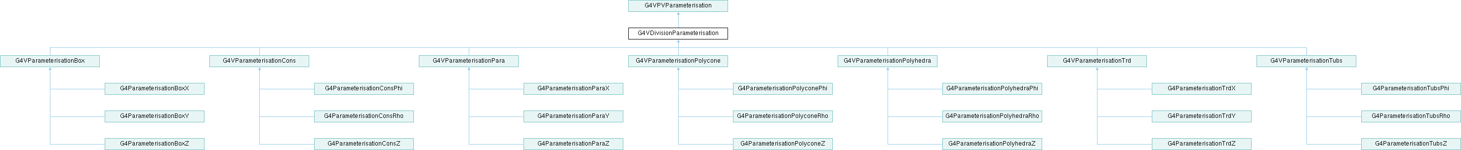 Implemented in G4ParameterisationBoxX, G4ParameterisationBoxY, G4ParameterisationBoxZ, G4ParameterisationConsPhi, G4ParameterisationConsRho, G4ParameterisationConsZ, G4ParameterisationParaX, G4ParameterisationParaY, G4ParameterisationParaZ, G4ParameterisationPolyconePhi, G4ParameterisationPolyconeRho, G4ParameterisationPolyconeZ, G4ParameterisationPolyhedraPhi, G4ParameterisationPolyhedraRho, G4ParameterisationPolyhedraZ, G4ParameterisationTrdX, G4ParameterisationTrdY, G4ParameterisationTrdZ, G4ParameterisationTubsPhi, G4ParameterisationTubsRho, and G4ParameterisationTubsZ.