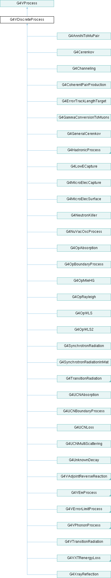Implemented in G4AnnihiToMuPair, G4Cerenkov, G4Channeling, G4CoherentPairProduction, G4ElNeutrinoNucleusProcess, G4ForwardXrayTR, G4GammaConversionToMuons, G4GammaGeneralProcess, G4GeneralCerenkov, G4HadronicProcess, G4LowECapture, G4MicroElecCapture, G4MicroElecSurface, G4MuNeutrinoNucleusProcess, G4NeutrinoElectronProcess, G4NeutronGeneralProcess, G4NeutronKiller, G4NuVacOscProcess, G4OpAbsorption, G4OpBoundaryProcess, G4OpMieHG, G4OpRayleigh, G4OpWLS2, G4OpWLS, G4PhononDownconversion, G4PhononReflection, G4PhononScattering, G4PolarizedAnnihilation, G4PolarizedCompton, G4SynchrotronRadiation, G4SynchrotronRadiationInMat, G4TauNeutrinoNucleusProcess, G4TransitionRadiation, G4UCNAbsorption, G4UCNBoundaryProcess, G4UCNLoss, G4UCNMultiScattering, G4UnknownDecay, G4VAdjointReverseReaction, G4VEmProcess, G4VTransitionRadiation, G4VXTRenergyLoss, and G4XrayReflection.