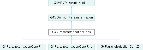 G4VParameterisationCons is the base class for the parameterised positioning equivalent to dividing a G4Cons along one of each axis Rho, Phi, Z.