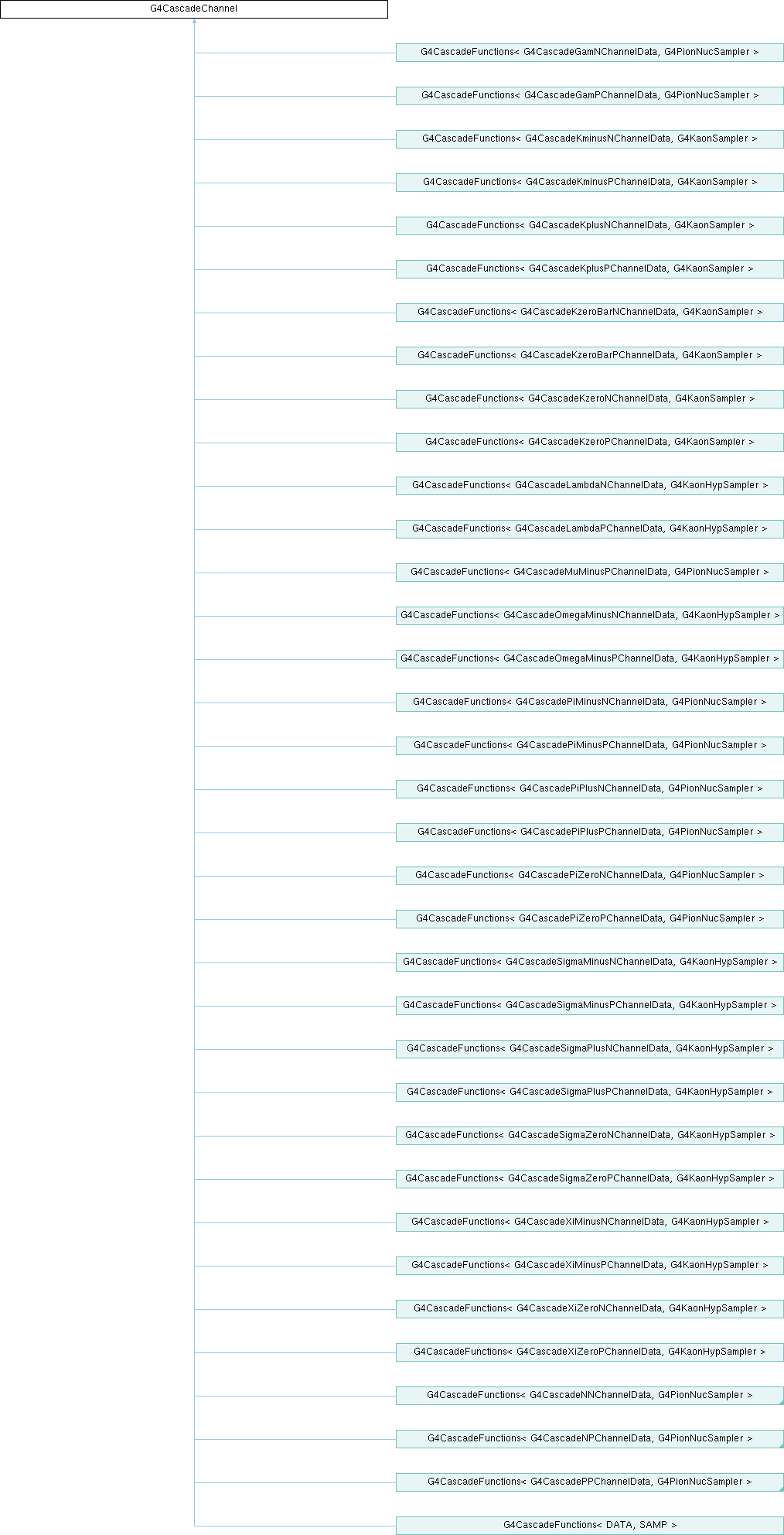 Implemented in G4CascadeFunctions< DATA, SAMP >, G4CascadeFunctions< G4CascadeGamNChannelData, G4PionNucSampler >, G4CascadeFunctions< G4CascadeGamPChannelData, G4PionNucSampler >, G4CascadeFunctions< G4CascadeKminusNChannelData, G4KaonSampler >, G4CascadeFunctions< G4CascadeKminusPChannelData, G4KaonSampler >, G4CascadeFunctions< G4CascadeKplusNChannelData, G4KaonSampler >, G4CascadeFunctions< G4CascadeKplusPChannelData, G4KaonSampler >, G4CascadeFunctions< G4CascadeKzeroBarNChannelData, G4KaonSampler >, G4CascadeFunctions< G4CascadeKzeroBarPChannelData, G4KaonSampler >, G4CascadeFunctions< G4CascadeKzeroNChannelData, G4KaonSampler >, G4CascadeFunctions< G4CascadeKzeroPChannelData, G4KaonSampler >, G4CascadeFunctions< G4CascadeLambdaNChannelData, G4KaonHypSampler >, G4CascadeFunctions< G4CascadeLambdaPChannelData, G4KaonHypSampler >, G4CascadeFunctions< G4CascadeMuMinusPChannelData, G4PionNucSampler >, G4CascadeFunctions< G4CascadeNNChannelData, G4PionNucSampler >, G4CascadeFunctions< G4CascadeNPChannelData, G4PionNucSampler >, G4CascadeFunctions< G4CascadeOmegaMinusNChannelData, G4KaonHypSampler >, G4CascadeFunctions< G4CascadeOmegaMinusPChannelData, G4KaonHypSampler >, G4CascadeFunctions< G4CascadePiMinusNChannelData, G4PionNucSampler >, G4CascadeFunctions< G4CascadePiMinusPChannelData, G4PionNucSampler >, G4CascadeFunctions< G4CascadePiPlusNChannelData, G4PionNucSampler >, G4CascadeFunctions< G4CascadePiPlusPChannelData, G4PionNucSampler >, G4CascadeFunctions< G4CascadePiZeroNChannelData, G4PionNucSampler >, G4CascadeFunctions< G4CascadePiZeroPChannelData, G4PionNucSampler >, G4CascadeFunctions< G4CascadePPChannelData, G4PionNucSampler >, G4CascadeFunctions< G4CascadeSigmaMinusNChannelData, G4KaonHypSampler >, G4CascadeFunctions< G4CascadeSigmaMinusPChannelData, G4KaonHypSampler >, G4CascadeFunctions< G4CascadeSigmaPlusNChannelData, G4KaonHypSampler >, G4CascadeFunctions< G4CascadeSigmaPlusPChannelData, G4KaonHypSampler >, G4CascadeFunctions< G4CascadeSigmaZeroNChannelData, G4KaonHypSampler >, G4CascadeFunctions< G4CascadeSigmaZeroPChannelData, G4KaonHypSampler >, G4CascadeFunctions< G4CascadeXiMinusNChannelData, G4KaonHypSampler >, G4CascadeFunctions< G4CascadeXiMinusPChannelData, G4KaonHypSampler >, G4CascadeFunctions< G4CascadeXiZeroNChannelData, G4KaonHypSampler >, and G4CascadeFunctions< G4CascadeXiZeroPChannelData, G4KaonHypSampler >.